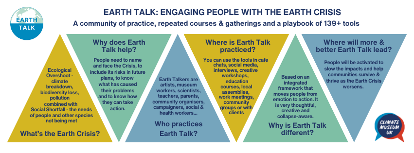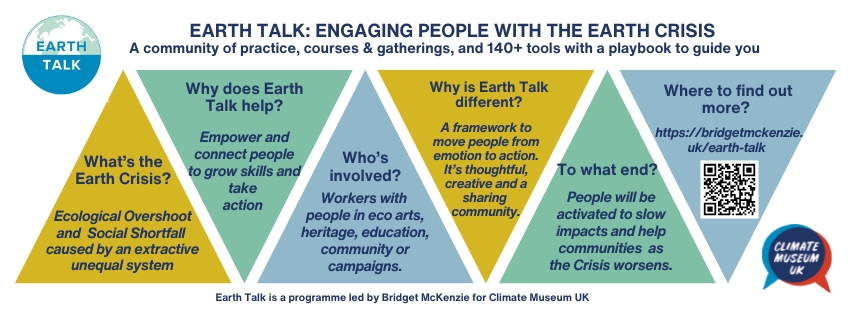 What happens to the money? I have been working voluntarily running Climate Museum UK since 2018, and developing the Earth Talk materials, so I will recoup some of my costs. I have set fees at a lower level than other similar courses. As the revenue grows, I will put aside some money to pay for guest speakers or co-facilitators.